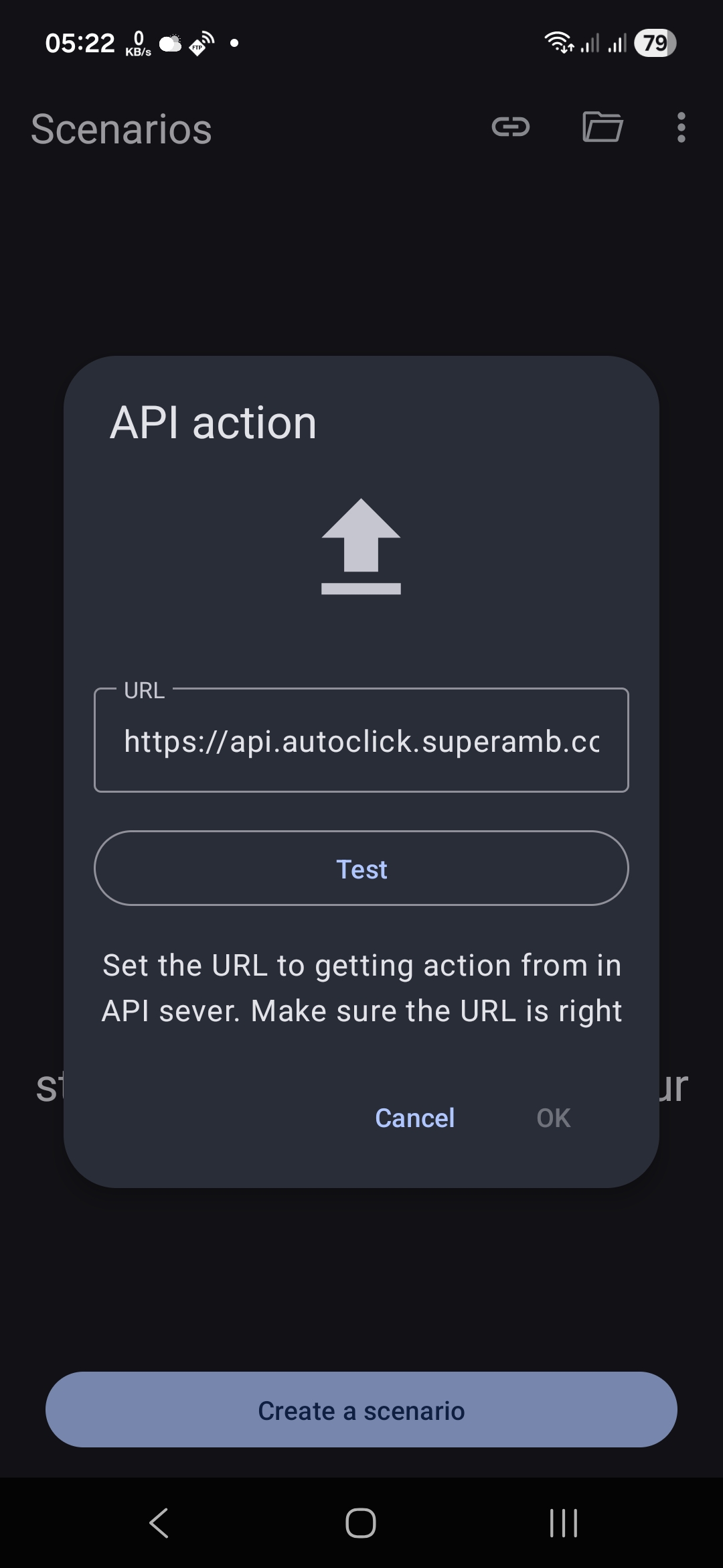 - Buka app, click tombol link yang ada di atas, input https://api.autoclick.superamb.com , lalu Test, pastikan response valid.